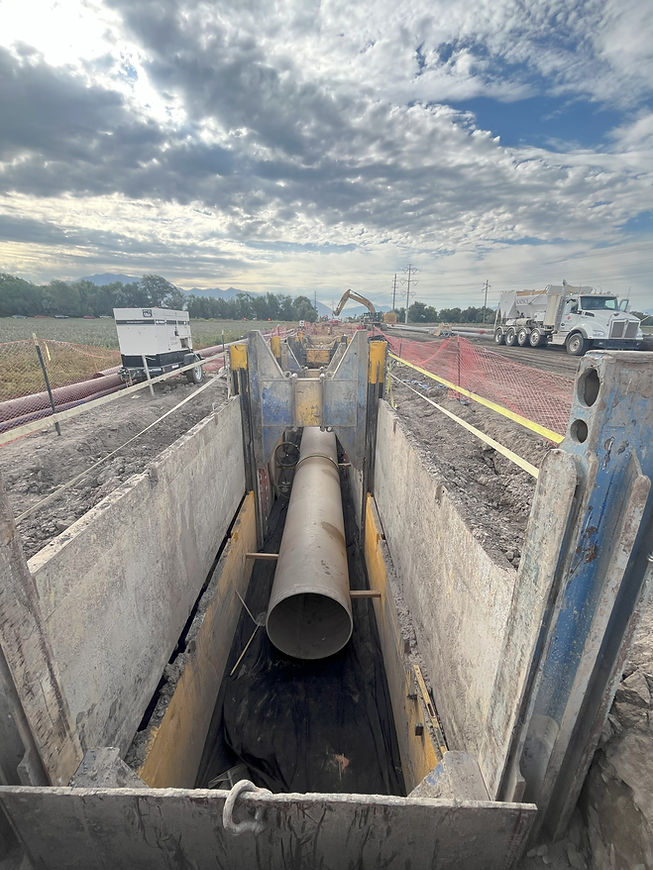 The contractor is currently crossing 380 West at about 900 South with the 60-inch Hobas pipe. In this roadway there are numerous utilities that must be accommodated or worked around. Some are capped and then fed from another direction, others are temporarily shut off until the pipe and the work zone are passed the involved utilities. One of the complications working through existing utility trenches is that they tend to collect water and channel it to the active work zone, making conditions even more complicated.
